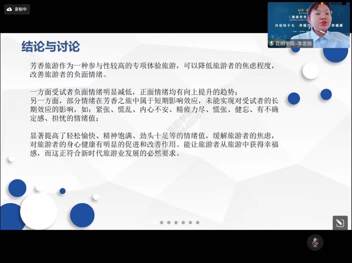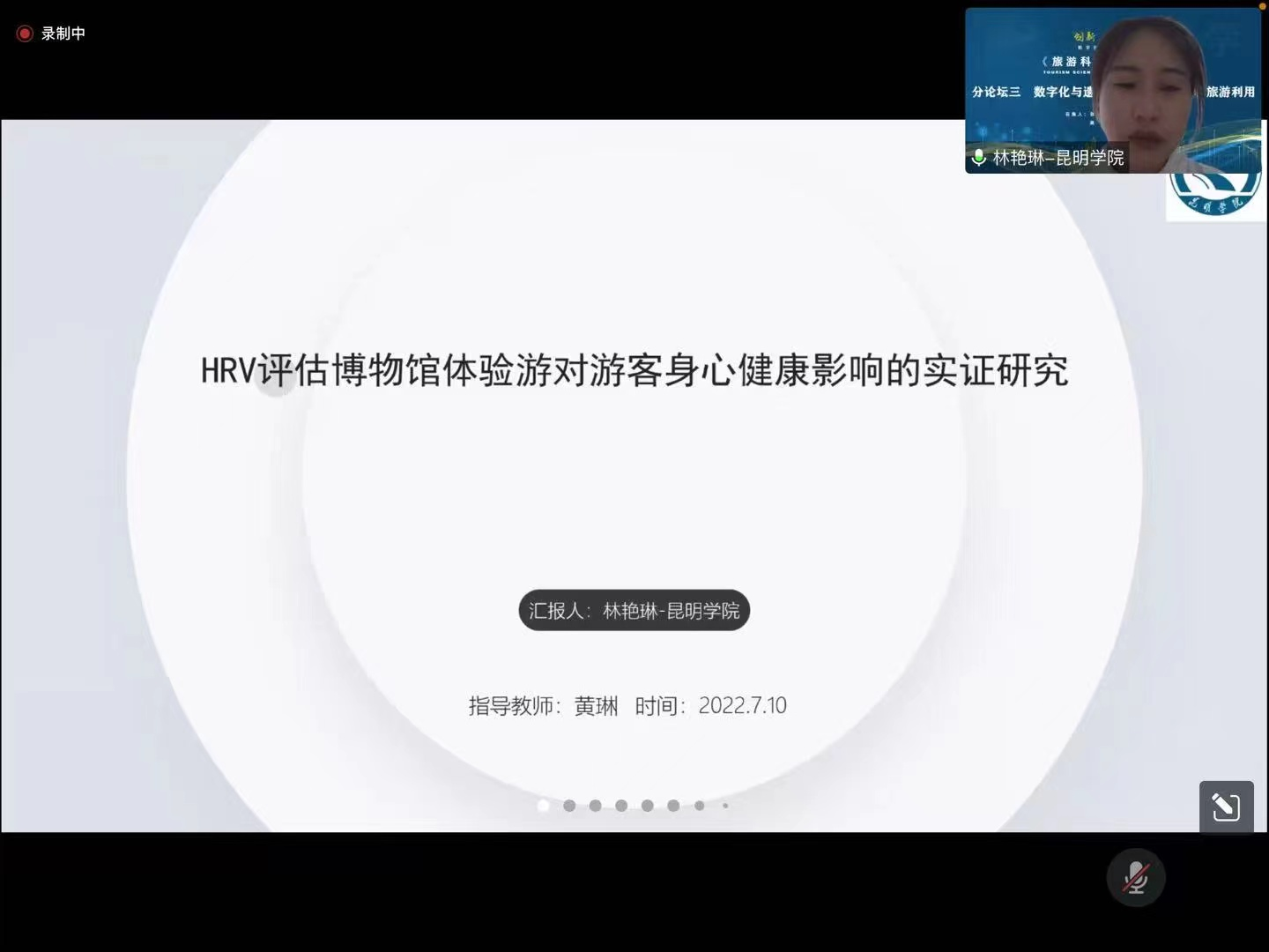 2019级旅游管理1班林艳琳同学为第一作者的论文《HRV评估博物馆体验旅游对游客身心健康影响的实证研究》,入选年会分论坛三“数字化与遗产保护、文化传承和旅游利用”;2020级旅游管理1班赵倩同学为第一作者的论文《HRV评估茶文化体验旅游对游客身心健康影响的实证研究》,入选年会分论坛八“旅游休闲城市与旅游休闲街区高质量发展”;2020级旅游管理1班李忠烜同学为第一作者的论文《芳香体验旅游对游客身心健康影响的实证研究》,入选年会分论坛十七“幸福产业与旅游者幸福感”。