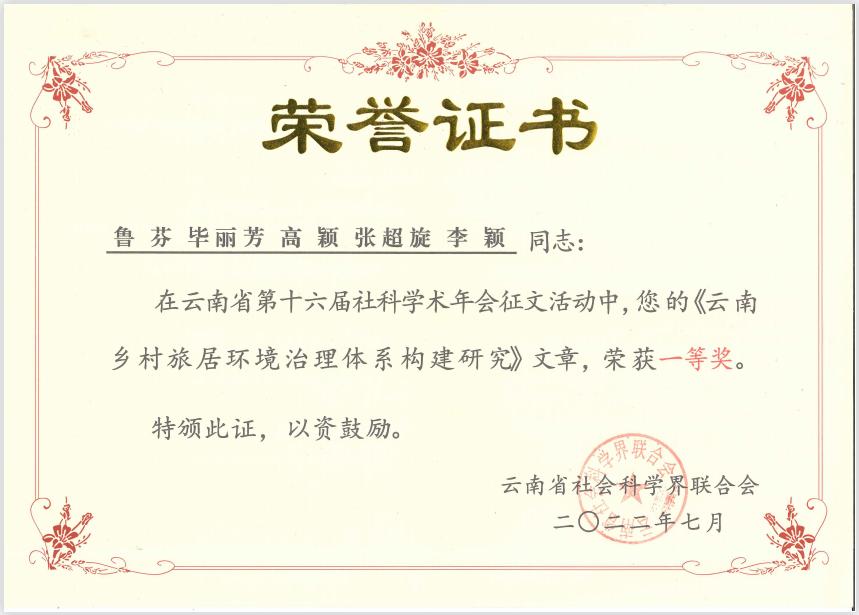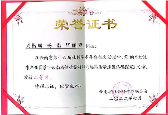 TapTap两名博士带领的研究团队在此次年会中获得了优秀论文一等奖和二等奖,他们分别是鲁芬博士乡村旅居研究团队的论文《云南乡村旅居环境治理体系构建研究》、周楷麟博士健康旅游研究团队的论文《大健康产业背景下云南省健康旅游目的地高质量建设路径探究》。鲁芬博士受邀出席年会现场和领奖仪式。
