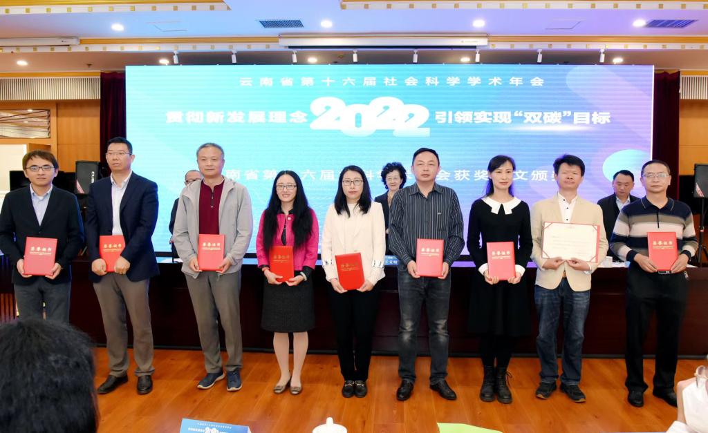 2022年9月27日,由中共云南省委宣传部、云南省社会科学界联合会主办的云南省第十六届社会科学学术年会在省社科联二楼会议中心举行。本次年会以“贯彻新发展理念,引领实现‘双碳’目标”为主题,会议以线上线下相结合的方式进行。大会向8个2022年云南省哲学社会科学创新团队授牌,为年会评选出的优秀论文获奖者代表颁奖。