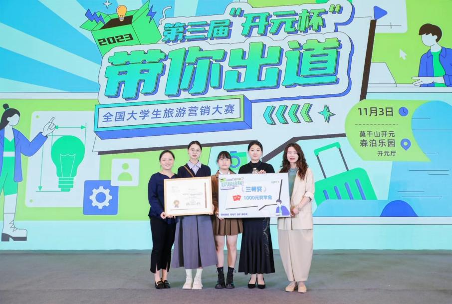 TapTap酒店教研室贺景老师带领2021级酒店管理2班魏双娅、孙亚拿、魏佳雨三位同学参加第三届“开元杯”——带你出道全国老员工旅游营销大赛并获得三等奖,贺景、杨祖蕊老师获得“优秀指导教师”。此次大赛聚集了来自全国70多家院校170余支队伍,经过激烈角逐,进入半决赛的44支队伍共有16支队伍最终闯进决赛。大赛为同学们提供了发挥旅游营销创意、充分展现自我风采的平台,得到众多旅游院校师生和旅游企业的广泛支持。