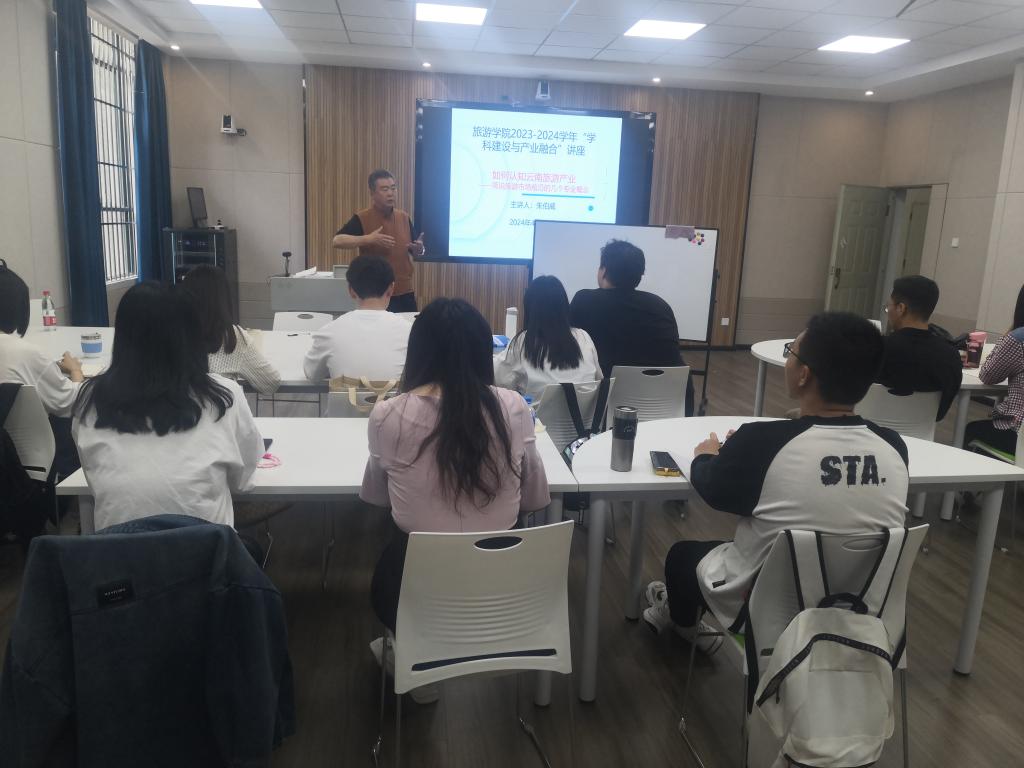 ​2024年“科研素养和社会实践融合”系列讲座第四讲于4月16日下午在惟行楼1105开讲。讲座邀请昆明市旅行社行业协会朱伯威会长作云南旅游产业的深入解读。讲座由​TapTap经理田芙蓉教授主持,相关专业本科生、研究生和部分教师50余人参加讲座。