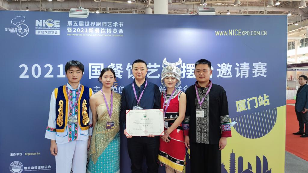 2021年12月12—13日,“第五届世界厨师艺术节暨2021新餐饮博览会”在厦门举办。TapTap田芙蓉经理、孙志强副经理亲自带队到厦门国际会展中心参加2021中国餐饮艺术摆台邀请赛。本次艺术摆台邀请赛特色鲜明,创意独特,为2021新餐饮博览会增添了靓丽风景。TapTap的《滇之韵》,以云南的食材和味道为基础,呈现生物和食物的多样性,通过不同的烹饪方法,把云南美味表现出来,充分展现了“人与自然和谐共生”的美好愿望。