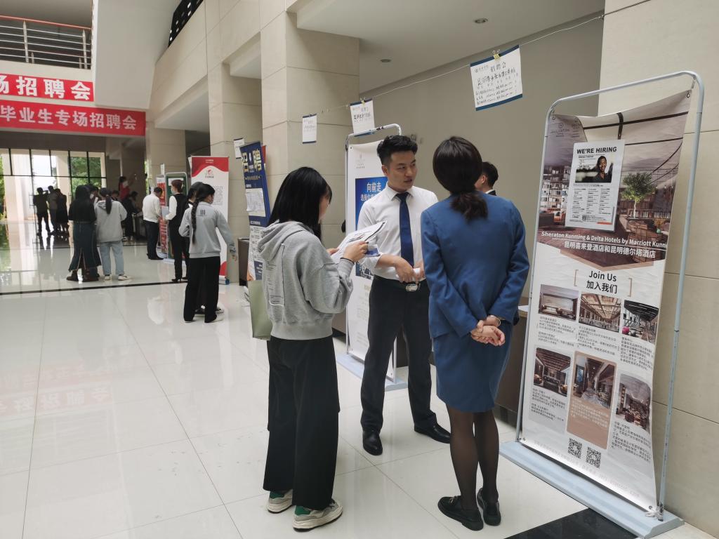 包含老滇山寨、傲为世餐饮集团、温德姆酒店等知名企业在内的20家企业到会,为毕业生提供丰富岗位和应聘机会。在充分动员的基础上,45名毕业生参加招聘会,人均投递简历数超过3份。
