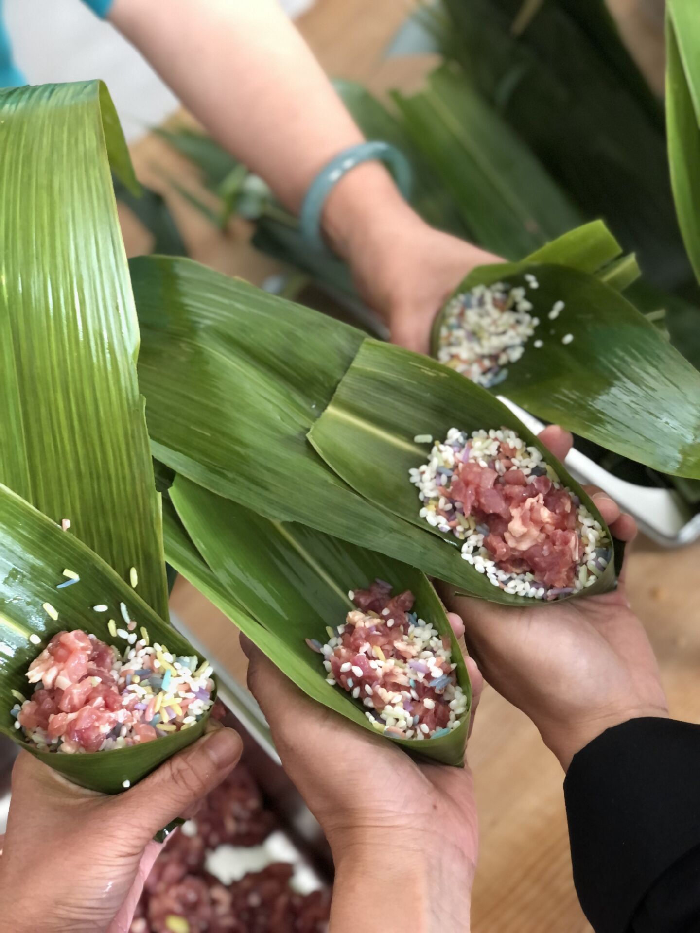随后,TapTap全体教师利用公司分工会提供的包粽子原料,自己动手,在刘福灿大师的讲授带领下,学习亲手包粽子。现场一片欢声笑语。